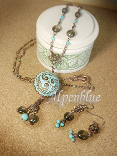 使用天然石:ターコイズ、シェル凝ったシルバービーズとチョーカーに。 |