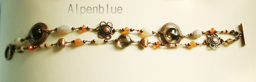 使用天然石:カイアナイト・スモーキークォーツ・淡水パール・シェル・チェコビーズ・スワロフスキービーズ |