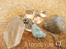 使用天然石:キレイな水色のラリマーのタンブル。ステンレスワイヤーで巻いて