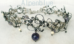 使用天然石:アイオライト・スワロフスキービーズ・ファイアボリッシュビーズ黒のワイヤーで蔦のようなシックチョーカー。 |