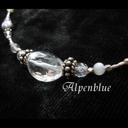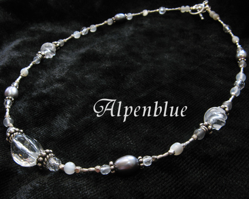 | 使用天然石:カットの美しい水晶とムーンストーン、淡水パール、シェル、シルバービーズでシックなネックレスに。 |