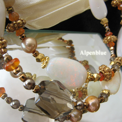 | 使用天然石:乳白色のオパール、スモーキークォーツ、淡水パールとカーネリアンを差し色にしたブレスレット。 |