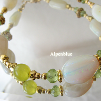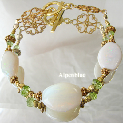 | 使用天然石:乳白色のオパールとペリドット、VermeilとK14gfのパーツでリッチなブレスレット。 |